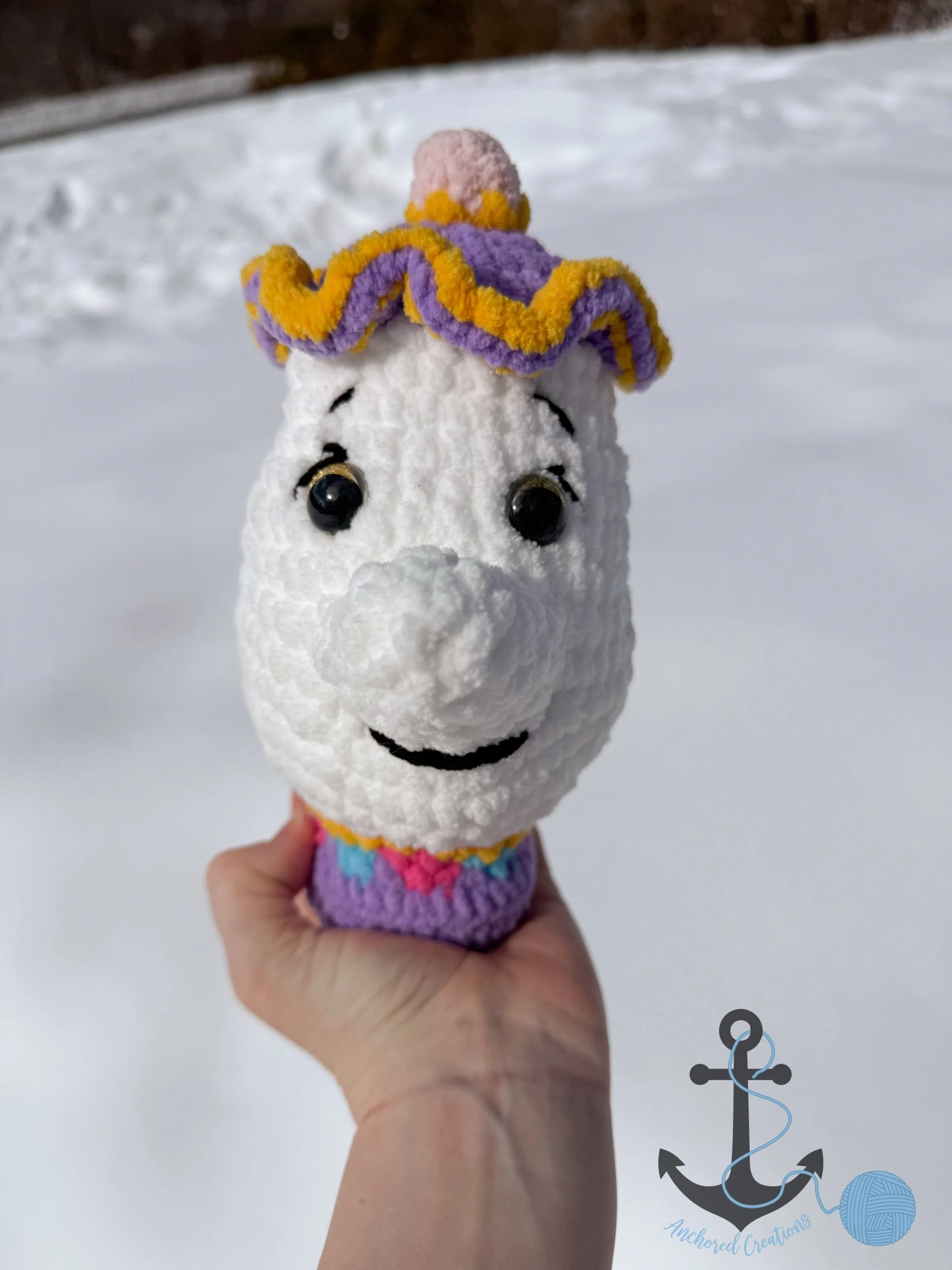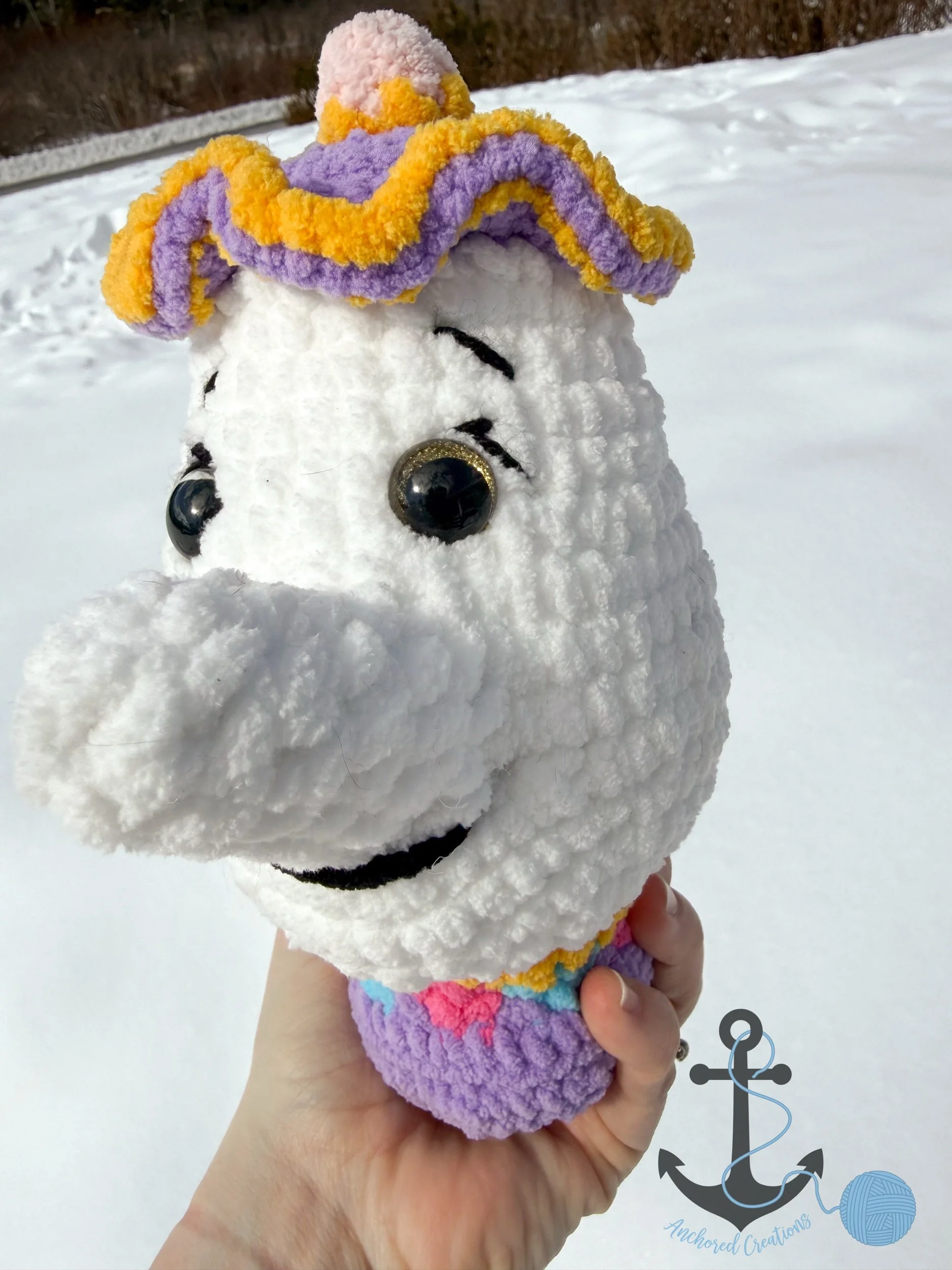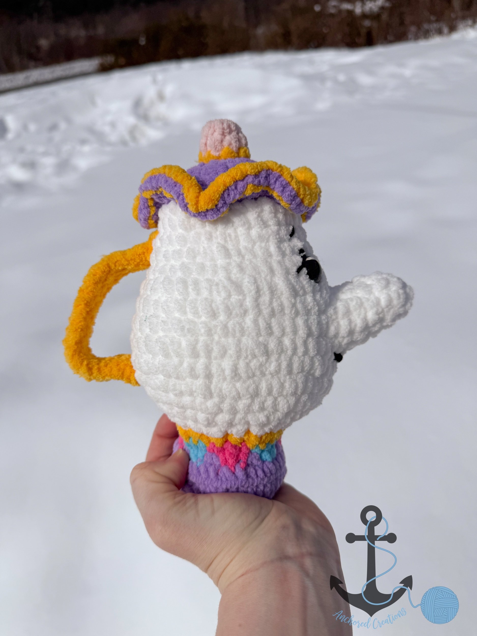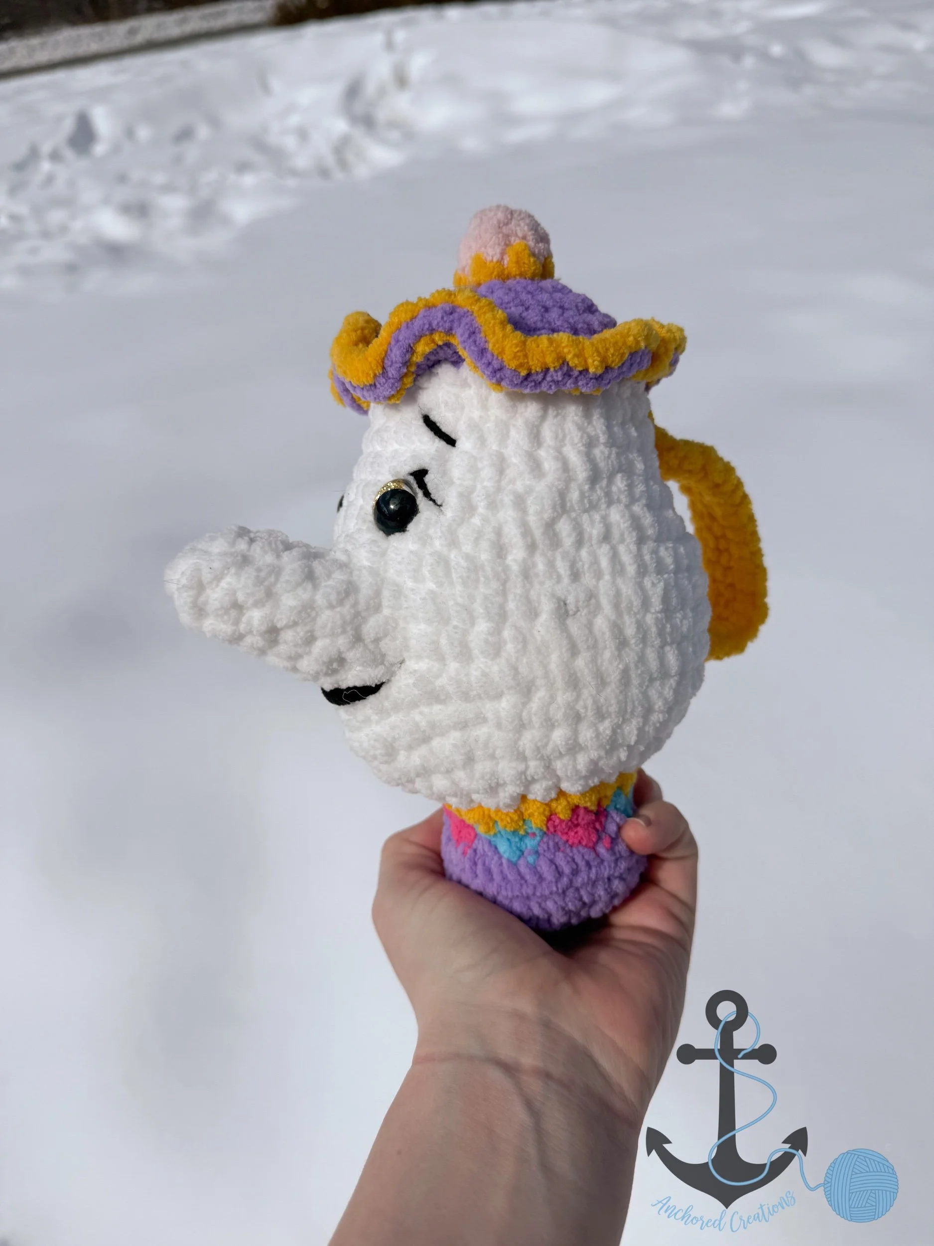 9 inches tall by 9 inches wide nose to handle (yarn and tension will change the size)